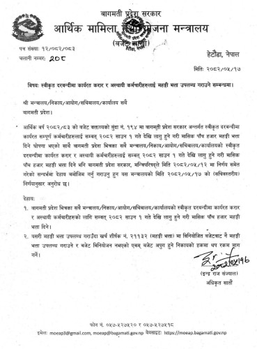वीरगंज । वगमती प्रदेश सरकारले आफनो मातहत रहेका स्वीकृत दरवन्दी भित्रका अस्थायी र करार कर्मचारीलाई महँगी भत्ता उपलब्ध गराउने भएको छ ।