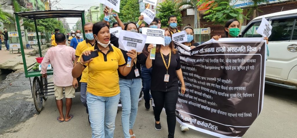सामाजिक सुरक्षा कोषकाविरुद्ध वीरगंजमा वाणिज्य बैंकका कर्मचारीहरुले प्रदर्शन गरेका छन्। कोषमा आफूहरुलाई जबरजस्ती आबद्ध गरी खाइपाइ आएको सेवासुविधा समेत कटौती गर्ने खोजिएको भन्दै उनीहरु बिरोधमा उत्रिएका हुन ।