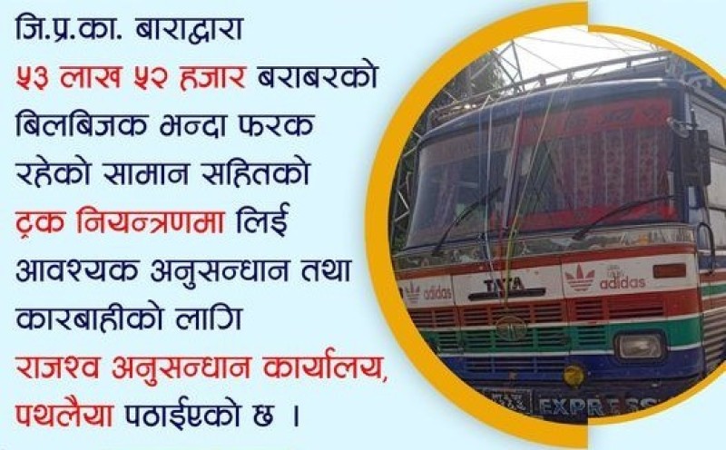 पथलैया । जिल्ला प्रहरी कार्यालय बाराद्वारा ५३ लाख ५२ हजार बराबरको बिलमा लेखिए भन्दा बढी समान नियन्त्रणमा लिएको छ ।