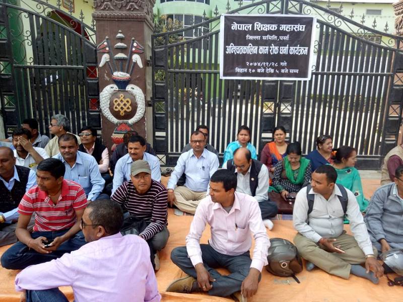पर्सा जिल्लाका तलव नपाएका तीन वटा स्थानीय तहका शिक्षकहरु आजबाट काम रोकेर धर्नामा उत्रिएका छन
