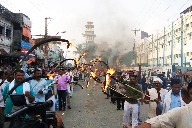 यूवा शक्ति संघको आयोजनामा आइतबार वीरगञ्जमा दुईजना न्यायमुर्तीहरुको प्रतिक राखेर बिरोध प्रदर्शन गरिएको छ ।