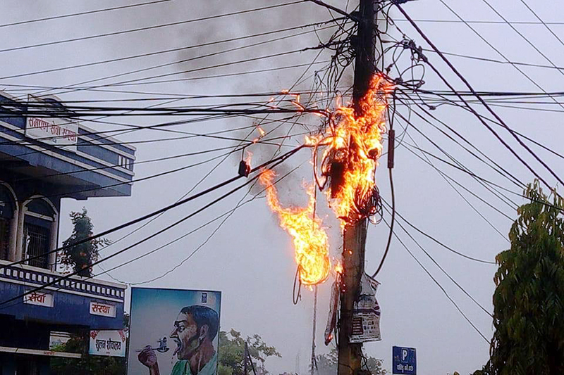 वीरगञ्जको घण्टाघर चौक र ठाकुरराम बहुमुखी क्याम्पस चौकमा रहेको बिजुलीको पोलमा आज बिहान आगलागी भएको छ ।