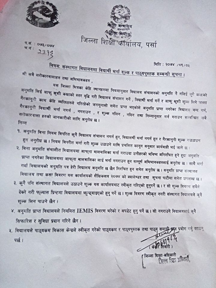 वीरगंज ६ बैशाख । जिल्ला शिक्षा कार्यालय पर्साले स्वीकृति नलिइकन मनपरि रुपमा शुल्क नतोक्न पर्साका निजी बिद्यालयहरुलाई निर्देशन गरेको छ ।