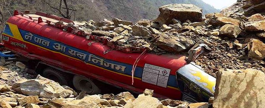 भरतपुर २१ चैत्र । नारायाणघाट–मुग्लिन सडक खण्डमा पर्ने घुमाउने भन्ने स्थानमा सडक माथिबाट माटोको ढिस्को अचानक खस्दा गाडीहरु पुरिएका छन् । ढिस्को झर्दा एकजनाको मृत्यु भएको छ भने एउटा जीप, ट्यांकर, ट्रक र दुईवटा बाइक पुरेको मुग्लिन प्रहरीले जनाएको छ । बिहान १० बजेतिर सडक माथिबाट ठूलो ढिस्को झरेको थियो । प्रहरीका अनुसार अहिले मुग्लिन तर्फबाट गएको एस्काभेटरले पुरिएका गाडीहरुलाई निकाल्ने प्रयास गरिरहेको छ ।