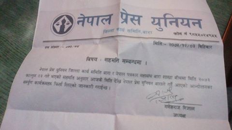 कलैया, ३ चैत . नेपाल प्रेस युनियन जिल्ला कार्य समिति बाराले आफ्नो आन्दोलनका सबै कार्यक्रम फिर्ता लिएको छ । नेपाल पत्रकार महासंघ बारा र नेपाल प्रेस युनियन जिल्ला कार्य समिति बारा बीच फाल्गुन २३ गते भएको सहमति अनुसार बिहीबारबाट आफ्नो आन्दोलनका सबै कार्यक्रम फिर्ता लिएको प्रेस युनियन जिल्ला कार्यसमिति बाराले जारी गरेको प्रेस बिज्ञप्तिमा उल्लेख गरीएको छ ।