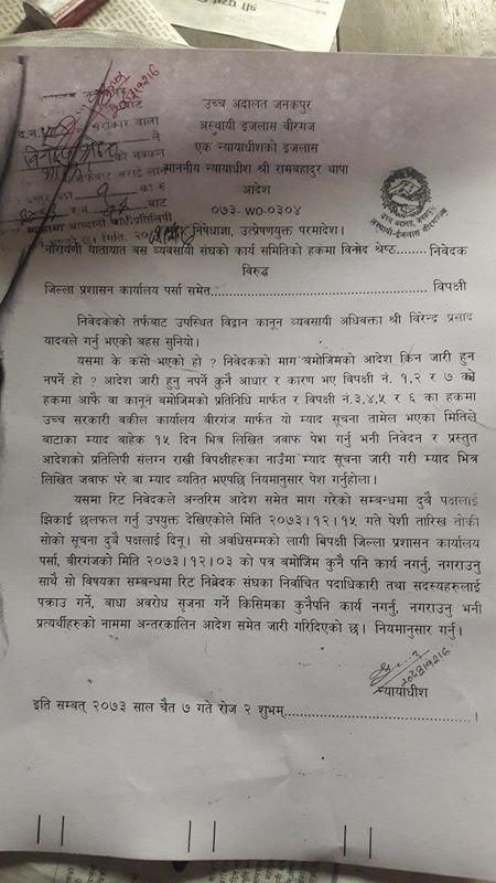 बीरगंज ७ चैत । नारायणी यातायात बस ब्यवसायी संघको कार्यसमितिलाई जिल्ला प्रशासन कार्यालय पर्साले पटके बिघठन गरेपछि सम्मानीत अदालतले उसको निर्णयलाई उल्ट्याई दिएको छ ।