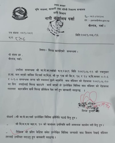 बीरगंज । स्काइलाइन इन्फ्रा प्रा.ली.ले चर्चेको जग्गा सम्बन्धमा नापी कार्यालय पर्साले नापजाँच गर्ने भएको छ । हालसाविक माँग भएबमोजीमा नापी कार्यालयले नापजाँचकालागि फिल्डमा प्राविधिक कर्मचारी खटाएको छ ।