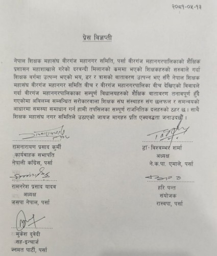 बीरगंज । पर्साका पाँच राजनीतिक दलले बीरगंज महानगरपालिकाले शिक्षा क्षेत्रमा डर त्रास र भयको वतावरण बनाएको गम्भिर आरोप लगाएका छन । पाँचै दलले बिहिवार एक प्रेस बिज्ञप्ति जारी गर्दै यस्तो आरोप लगाएका हुन । शैक्षीक क्षेत्रमा यस्तो वतावरण बनाईनुलाई दलहरुले गम्भिर रुपमा लिएको देखिन्छ ।