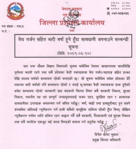 बीरगन्ज । पर्साका प्रमुख जिल्ला अधिकारी दिनेश सागर भूषालले बिहिवार साँझ एक सूचना प्रकाशीत गरि भारी वर्षा हुने मौसम विज्ञान विभागले प्रक्षेपण गरेकोेले सावधानी अपनाउन आग्रह गरेका छन ।