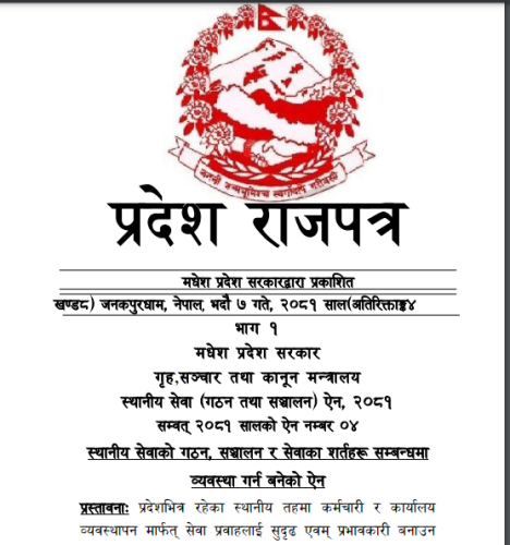 बीरगंज । मधेश प्रदेश सरकारले स्थानीय सेवा ऐन गृह तथा संचार मंत्रालयले राजपत्रमा प्रकाशित गरेको छ । ऐन राजपत्रमा प्रकाशीत भएपछि कार्यान्वयनमा आउने भएको छ । स्थानीय सेवाको गठन, तथा सञ्चालन ऐन २०८१ भदौ ५ गते प्रदेश प्रमुखले प्रमाण्ीकरण गरेपछि मधेश प्रदेश सरकारले ऐन राजपत्रमा प्रकाशन गरेको गृह तथा संचारमंत्री राजकुमार लेखीले बताए ।