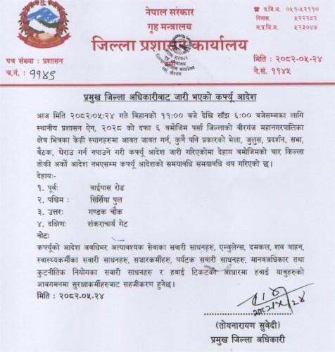 वीरगन्ज । पर्सा जिल्ला प्रशासन कार्यालयले वीरगन्ज महानगरपालिकाका केही क्षेत्रमा जारी गरेको कर्फ्युको समय थप गरेको छ।