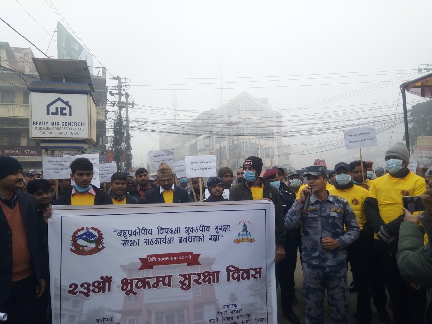 राष्ट्रिय भूकम्प दिवसको अवसरमा आज वीरगन्जमा पनि जनचेतनामूलक प्रभातफेरी निकालिएको छ । १९९० साल माघ २ गते आएको शक्तिशाली विनासकारी भूकम्पले क्षति पु¥याएको दिनलाई भूकम्प दिवसको रुपमा मनाउदै आएको छ । कोणसभामा बोल्ने वक्ताहरुले भूकम्पको क्षति न्यूनीकरण तथा जोखिमबाट बच्नका लागि भवन निर्माण संहिताको पूर्ण पालना गर्नुपर्नेमा जोड दिएका छन् ।