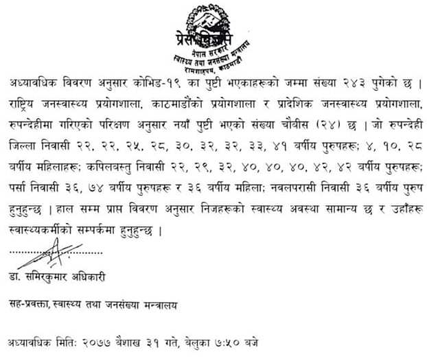 पर्सामा एक महिला सहिथ दुई पुरुष गरि तीन जनामा कोरोना भाइरसको संक्रमण पुष्टि भएको छ