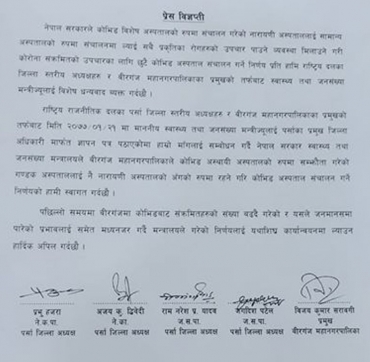 राष्टिय राजनीतिमा प्रभाव राख्ने चार दलका पर्सेली नेताहरुले बीरगंजको कोभिड अस्पताल संचालनकालागि मंत्रालयले गरेको निर्णयलाई यथाशिघ्र कार्यान्वयनमा ल्याउन माँग गरेका छन