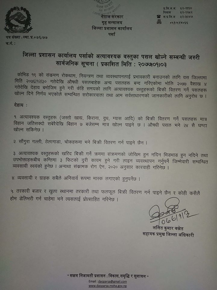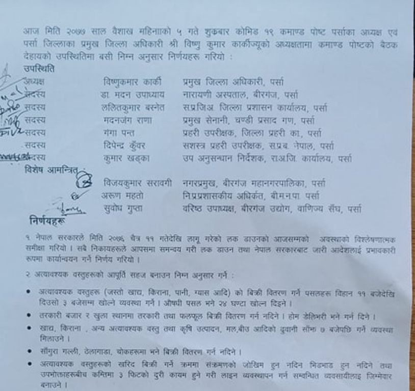 कोभिड १९ कमाण्ड पोष्ट पर्साको शुक्रवार बसेको बैठकले लकडाउनको प्रभावकारिताकालगि नयाँ प्रवन्धहरु सार्वजनीक गरेको छ