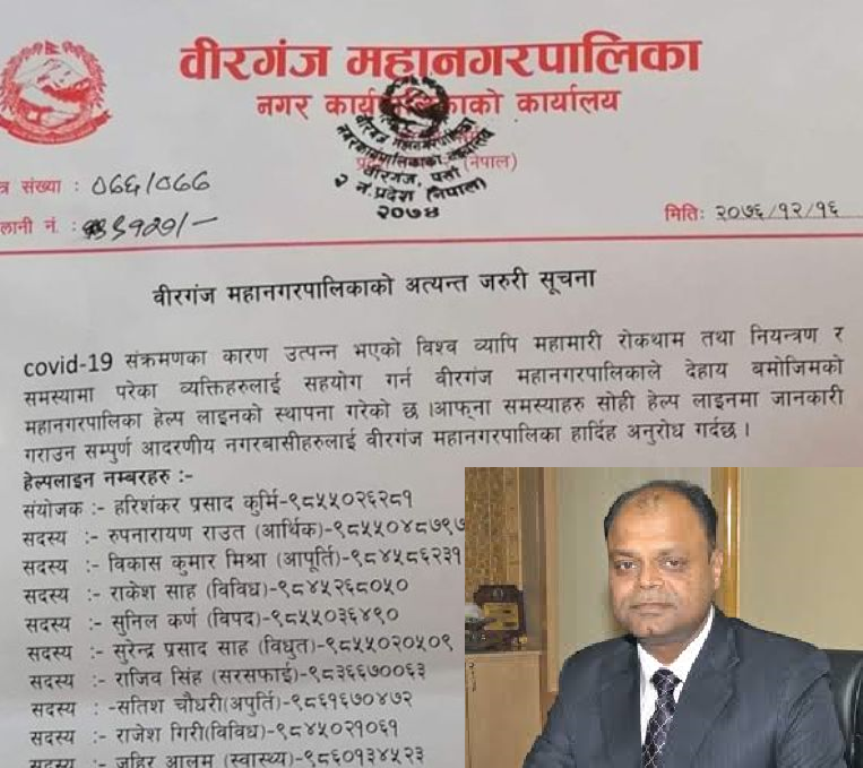 बीरगंजमा कोरोना संक्रमणको नियन्त्रण अभियानको नेतृत्व लिएर काम गरिरहेको बीरगंज महानगरपालिकाले हेल्पलाइन नम्बरहरु सार्वजनीक गरेको छ