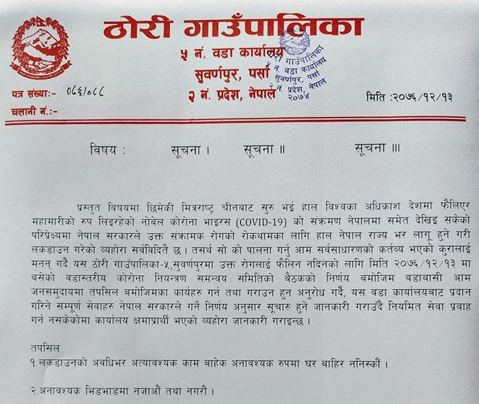 ठोरी गाउँपालिका को वडा नं ५ मा मासुजन्य बस्तुको काटमार बिक्री बितरण तथा मदिराजन्य बस्तुको उत्पादन र बेचबिखनलाई पूर्ण प्रतिवन्ध लगाइएको छ