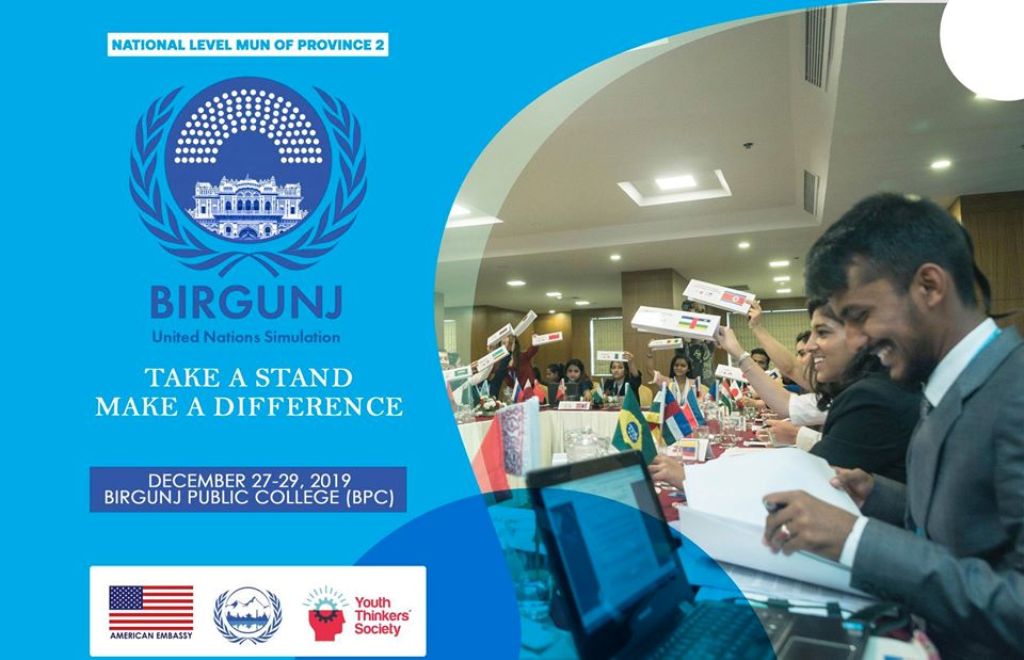 बैचारिक युवा समाज ले अमेरिकि दुतावास नेपालको सहकार्यमा बिरगंजमा ११ गते देखी १३ गते सम्म बिरगंज संयुक्त राष्ट्र नक्कल ९० पहिलो संस्करण आयोजना गर्ने छ