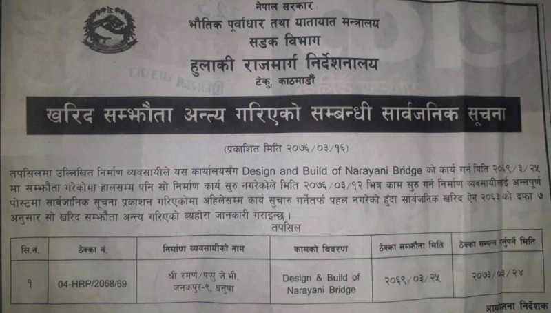 नारायणी पुल बनाउन नसकेको भन्दै “रमन-पष्पु-जेभी” कन्स्ट्रक्सन कम्पनीसँग गरिएको सम्झौंता सडक विभाग, हुलाकी राजमार्ग निर्देशनालय टेकुले तोडेको छ