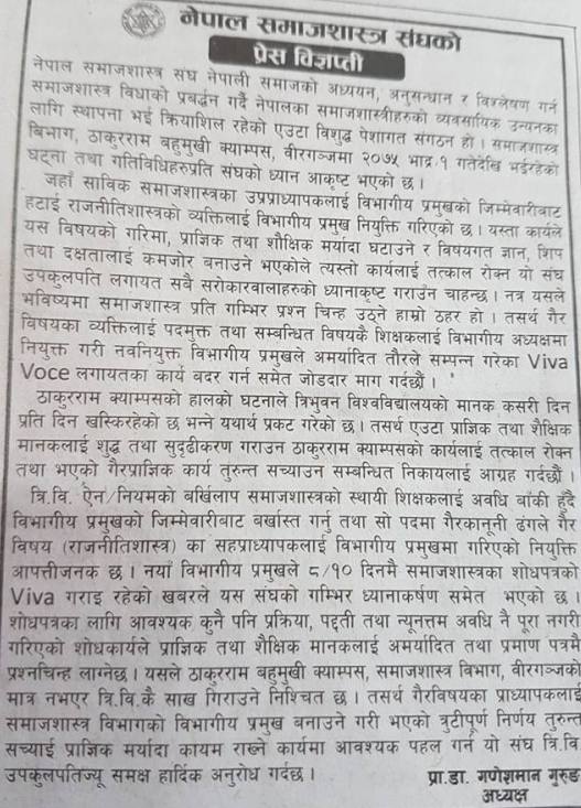 त्रिभूवन बिश्व बिद्यालयको आगिंक क्याम्पसको रुपमा रहेको बीरगंजको ठाकुरराम बहुमुखी क्याम्पसमा बिश्वबिद्यालयले छानविन आयोग पठाएको छ