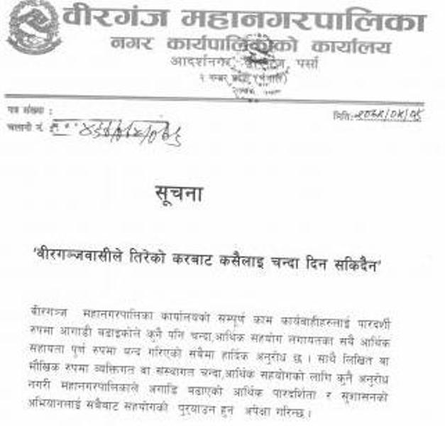 बीरगंज महानगरपालिकाले आर्थिक चन्दा दिने काममा रोक लगाएको छ