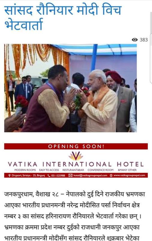 पर्साको क्षेत्र नं ३ बाट निर्वाचित सासद हरिनारायण रौनीयारले भारतीय प्रधानमंत्री नरेन्द्र मोदीसंग भेटवार्ता भएको भन्दै काल्पनीक समाचार प्रकाशमा आएको छ