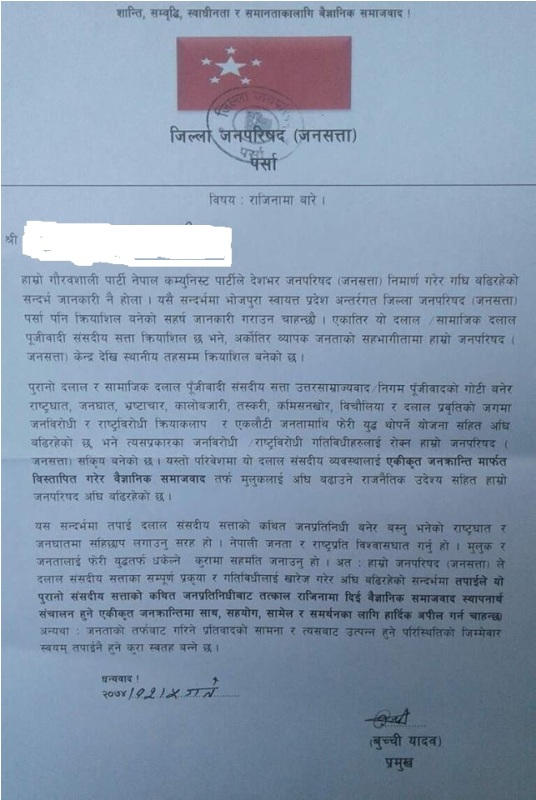 नेत्रविक्रम चन्द बिप्लव नेतृत्वको नेपाल कम्युष्टि पार्टी ले स्थानीय तहका जनप्रतिनिधिहरुको राजीनामा मागेको छ