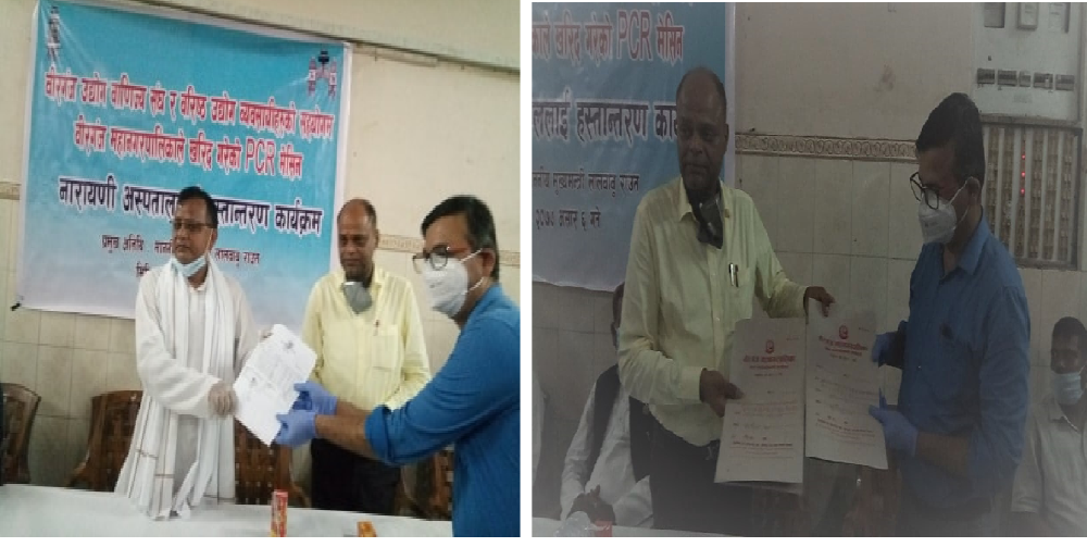 वीरगन्ज महानगरपालिकाले खरिद गरेको पीसीआर मेशिन नारायणी अस्पताललाई हस्तान्तरण गरेको छ । वीरगन्ज उद्योग वाणिज्य संघ तथा वीरगन्जका उद्योगी व्यवसायी तथा विभिन्न संघ संस्थाहरुको आर्थिक सहयोगमा खरिद गरिएको पीसीआर मेशिन शनिबार नारायणी अस्पताललाई हस्तान्तरण गरिएको हो ।