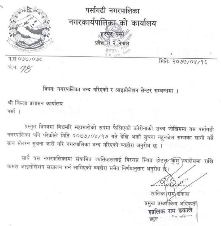 पर्सागढी नगरपालिकाले शुक्रवार जिल्ला प्रशासन कार्यालय पर्सालाई एक पत्र लेखेर नगरभित्र कोरोना भाइरसको संक्रमण पुष्टि भएकाहरुलाई बीरगंजको होटेल कुमु प्यालेशमा आइसोलेशन गरिने जानकारी दिनु भएको ।