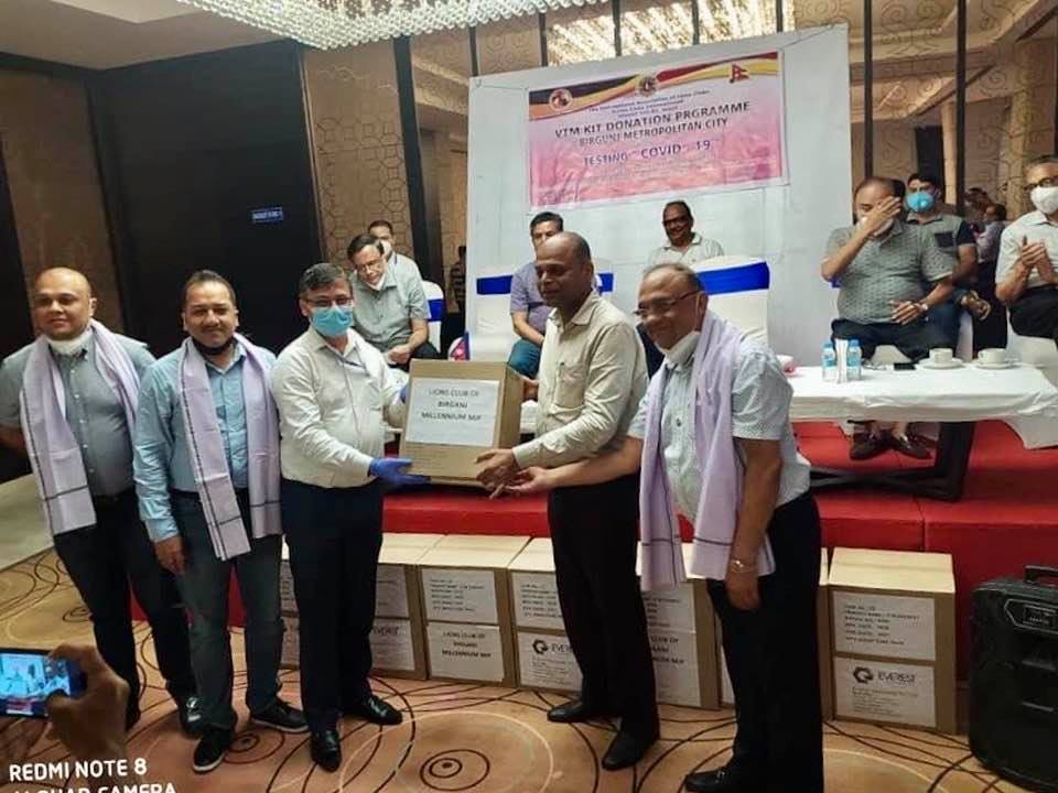 वीरगन्जका तीनजना व्यवसायीले कोरोना भईरस कोभिड–१९ परीक्षणमा प्रयोग हुने भीटीएम किट वीरगन्ज महानगरपालिकालाई मंगलबार हस्तान्तरण गरेको छ । महानगरपालिकाले कोरोना संक्रमण नियन्त्रणका लागि पीसीआर मेशिन खरिद गरेपछि कोरोना परीक्षणका लागि आवश्यक ४ हजार ५ सय भीटीएम किट वीरगन्ज महानगरपालिकालाई तीनजना व्यक्तिले उपलब्ध गराएको हो ।