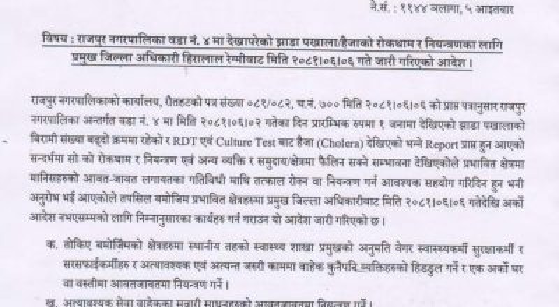 रौतहट, ४ असोज । रौतहटको राजपुर नगरपालिकामा हैजाको प्रकोप फैलिएको छ । प्रादेशिक अस्पताल गौरमा आरडिटी प्रविधिबाटस्याम्पल परिक्षण गर्दा ६ जनाको स्याम्पलमा पोजेटिभ अर्थात हैजाको किटाणु फेला परेको प्रादेशिक अस्पताल गौरले जनाएको छ ।