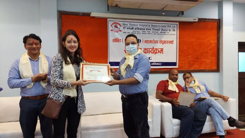 वीरगन्जको भवानी हस्पिटल एण्ड रिसर्च सेण्टरले कोरोना महामारीमा अस्पतालमा खटिएका चिकित्सक, स्वास्थ्यकर्मी र कर्मचारीहरु तथा स्वास्थ्य समाग्री आपूर्तिकर्ताहरुलाई सम्मान गरेको छ ।