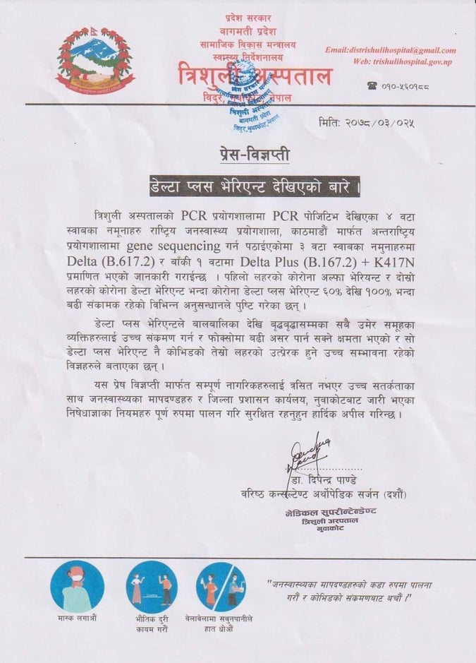 नुवाकोटस्थित त्रिशुली अस्पतालमा कोरोना परीक्षण गरिएको एक जनामा डेल्टा प्लस भेरियन्ट देखिएको छ।