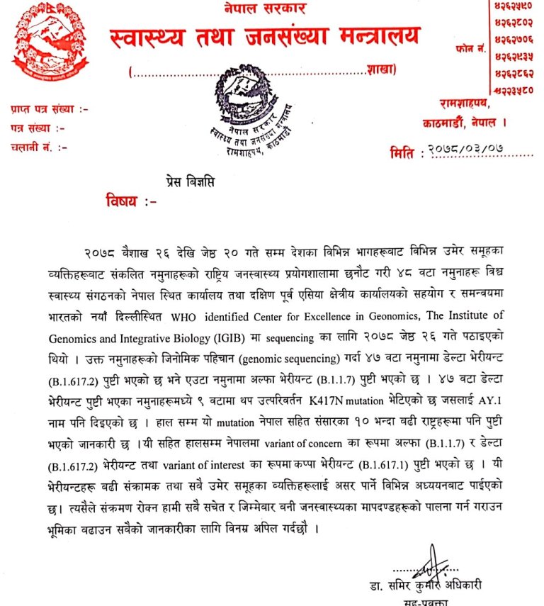 नेपालमा कोरोना भाइरसको नयाँ भेरियन्ट भेटिएको छ । स्वास्थ्य तथा जनसंख्या मन्त्रालयले जिन सिक्विन्सका लागि ४७ वटा नमूना दिल्ली पठाइएको थियो ।