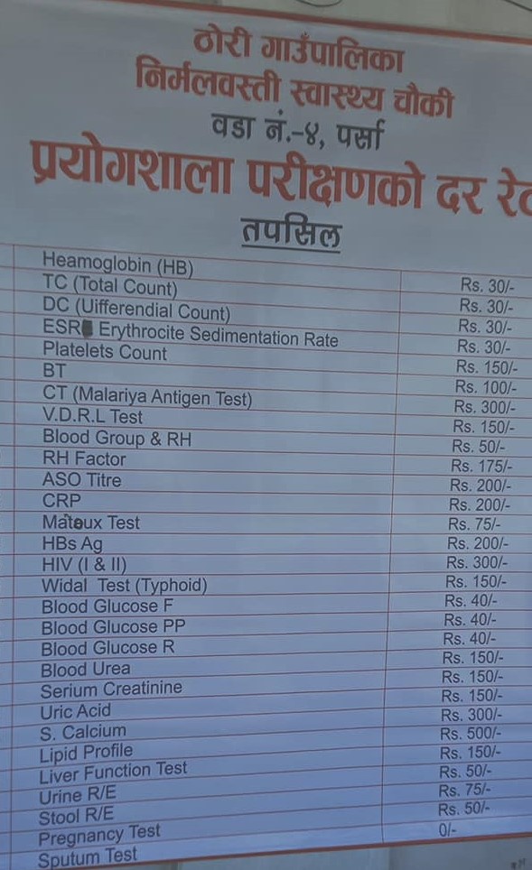 ठोरी गाउँ पालिकाको वडा नं ४ निर्मलवस्तीमा रहेको स्वास्थय चौकीमा आज देखी बिभिन्न रोगको परिक्षण हुने भएको छ ।