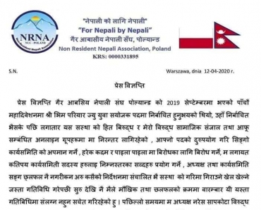एनआरएनए पोल्याण्डले यहाँ रहेका नेपालीहरुको लागि कोरोनाको समस्यामा राहत र सहयोग गर्ने उद्देश्यले तीस हजार ज्लोतीको कोष सहित सर्वपक्षीय आपतकालिन समिति बनाएको छ ।