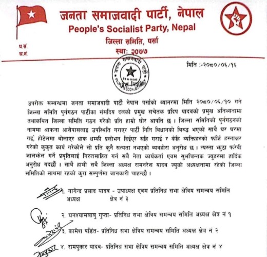 बीरगंज । जनता समाजवादी पार्टी पर्साको चारवटा क्षेत्रीय सभापतिले एक बिज्ञप्ति निकाली आफूलाई पार्टीको संस्थापन पक्षमा उभ्याएका छन ।