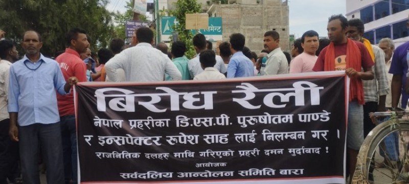 कलैया । प्रहरी ज्यादती विरुद्ध बाराको कलैयामा शुक्रबार भएको सर्वदलिय विरोध प्रर्दशनमा हजारौं सर्वसाधारणले सहभागिता जनाएका छन् ।