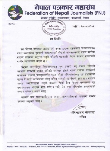 काठमाण्डौ । नेपाल पत्रकार महासंघले प्रेस चौतारी नेपालका अध्यक्ष एवं जनता टाइम्स डटकमका प्रधान सम्पादक गणेश बस्नेतविरूद्ध नेपाल प्रहरीमा साइबर क्राइमको कसुरमा उजुरी गरिएको घटनाप्रति आपत्ति जनाएको छ।
