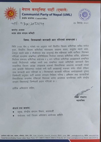वीरगन्ज । नेपाल कम्युनिष्ट पार्टी एमाले पर्साले ०७९ मंसीर ४ को चुनावमा पार्टीका उम्मेदवार बिरुद्ध अन्र्तघात गरेको भन्दै गरिएको कारवाहीलाई पार्टीको केन्द्रीय कमिटीले बदर गरेको छ ।