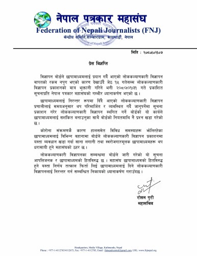 काठमाडौँ । नेपाल पत्रकार महासंघ केन्द्रीय कमिटीले लोककल्याणकारी विज्ञापनलाई निरन्तरता दिन माँग गरेको छ । विज्ञापन बोर्डले चालु आर्थिक वर्षको डेढ महिनाको लाकेकल्याण्कारी बिज्ञापनको रकम नदिने निर्णय गरेपछि नेपाल पत्रकार महासंघले एक बिज्ञप्ति जारी गरि रकम उपलब्ध गराउन माँग गरेको हो ।