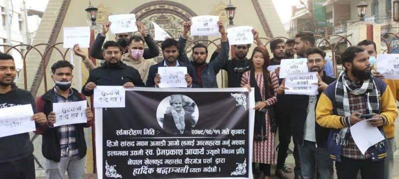 वीरगंज । नेकपा एमाले निकटको नेपाल खेलकुद महासंघ वीरगंज महानगर कमिटिले वीरगंजमा प्रदर्शन गरेको छ । मंगलबार आत्मदाहको प्रयास गरेका प्रेमप्रसाद आचार्यको बुधवार उपचारको क्रमा मृत्यु भएको घटनालाई लिएर महासंघ सडकमा उत्रिएको हो ।