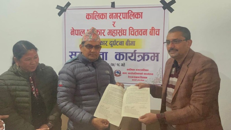 चितवनको कालिका नगरपालिकाले नेपाल पत्रकार महासंघ चितवन शाखाका सदस्यहरुको १० लाखको दुर्घटना बीमा गर्ने भएको छ । नगरपालिका र महासंघबीच दुर्घटना बीमा सम्बन्धी सम्झौतापत्रमा सोमवार एक कार्यक्रमकाबीच हस्ताक्षर गरिएको छ ।