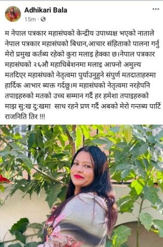 नेपाल पत्रकार महासंघका उपाध्यक्ष बाला अधिकारीले अबको आफ्नो गन्तब्य पार्टी राजनीति भन्दै नेपाल पत्रकार महासंघको उपाध्यक्षको जिम्मेवारीबाट अलग भएको घोषणा गर्नुृ भएको छ ।