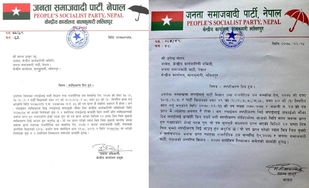 जनता समाजवादी पार्टी [जसपा]को उपेन्द्र यादव पक्षले महन्थ ठाकुर पक्षका ४ नेतालाई पुनः २४ घण्टे स्पष्टीकरण सोधेको छ ।