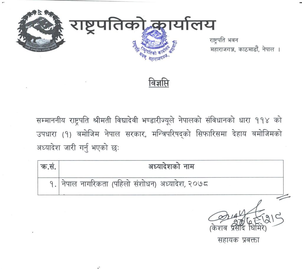 राष्ट्रपति विद्यादेवी भण्डारीले नागरिकतासम्बन्धी अध्यादेश जारी गनुृ भएको छ ।