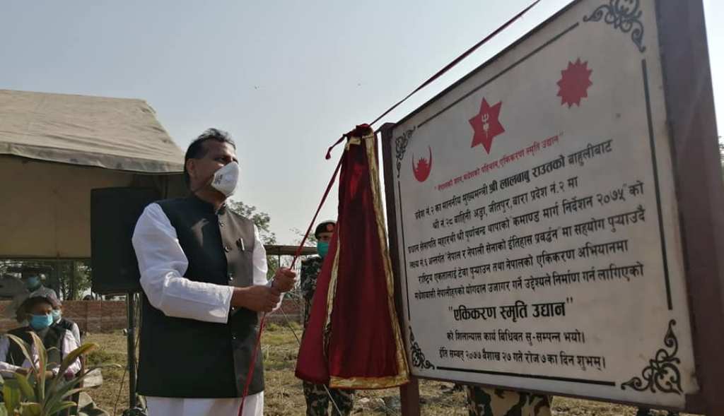 प्रदेश २ का मुख्यमंत्री लालबाबु राउत गद्धीले शनिवार सैनीक बाहिनीमा एकिकरण स्मृति उद्यानको शिलान्यास गर्नुृ भएको छ
