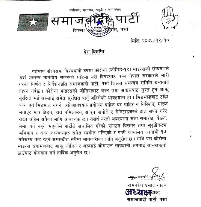 विश्वव्यापी रुपमा फैलिरहेको कोरोना भाइरसको जोखिमबाट आफू पनि बच्न र अरुलाई पनि सुरक्षित राख्न समाजवादी पार्टी पर्साले अनुरोध गरेको छ