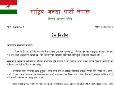 राजपाका बीरगंज महानगर अध्यक्ष ओम प्रकाश सर्राफले आइतवार एक बिज्ञप्ति जारी गरि मेडिकल हवको रुपमा रहेको बीरगंजमा पनि कोरोना भाइरसको परिक्षण गर्न सकिने सुविधा सम्पन्न प्रयोगशाला निर्माणको माँग गर्नु भएको छ