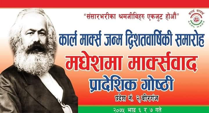 वीरगन्जमा बुधबार हुने विश्व विख्यात विद्धान कार्ल माक्र्सको द्विशतबार्षिकी तथा प्रादेशिक गोष्ठीको अन्तिम तयारी पूरा भएको छ । नेपालका कम्युनिष्ट नेताहरुको उपस्थितिमा कार्ल माक्र्सको बारेमा मधेसमा जागरण फैलाउने उद्देश्यले आयोजना गर्न लागिएको प्रादेशिक गोष्ठीमा प्रदेश नम्बर २ का आठ वटा जिल्लाबाट एकहजार जनाको सहभागिता रहने आयोजकले जनाएको छ ।